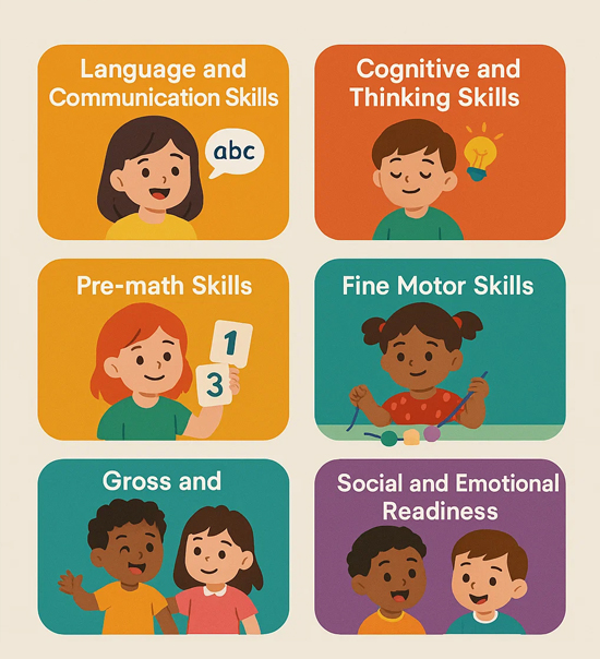 - Language and Communication Skills - Cognitive and Thinking Skills - Pre-math Skills - Fine Motor Skills - Gross Motor Skills - Social and Emotional Readiness - Self-help and Independence