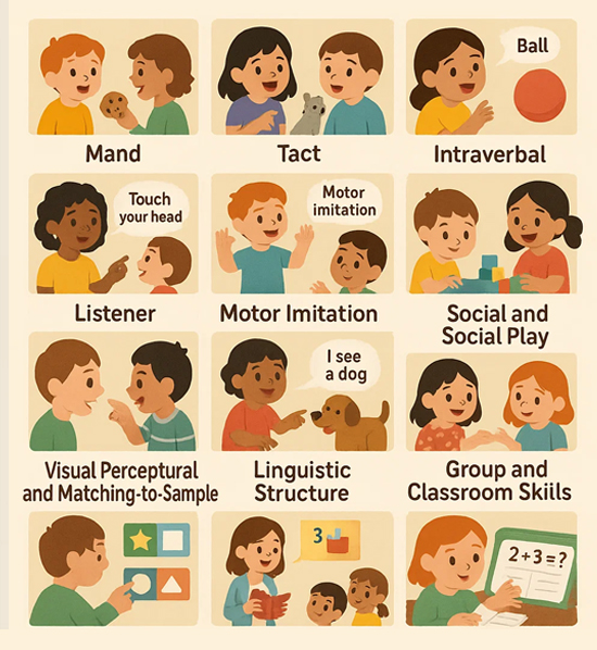 This program focuses on language and academic skills. Students will learn to ask for things ( mand ), name things they see ( tact ), repeat words (echoic), answer questions (intraverbal), follow directions (listener), copy movements (motor imitation), play alone (independent play), interact with others (social and social play), understand what they see and match objects (visual perceptual and matching-to-sample), use sentences (linguistic structure), participate in group and classroom activities (group and classroom skills), and begin learning school subjects (early academics).